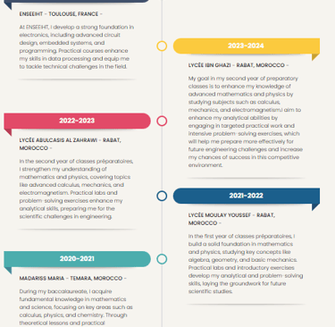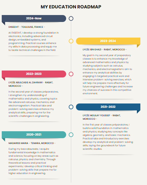 I completed an intensive two-year preparatory program in Mathematics and Physics (MP) , designed to prepare students for top French engineering schools through a highly demanding academic pace. I was then admitted to an engineering school (INP-ENSEEIHT Toulouse), where I further developed a strong interest in electronics mainly, and in applied mathematics and artificial intelligence alongside my academic curriculum. This path provided me with solid analytical foundations and a rigorous approach to complex engineering problems.