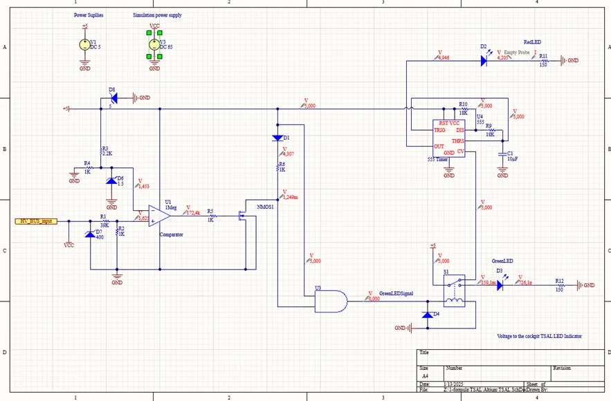 This blog presents the design and development of a Tractive Active System Light (TSAL) for a racing vehicle. The project focuses on creating a reliable electronic circuit to monitor traction and ensure safe vehicle operation under all conditions. It covers the complete process, from understanding the system’s logic and establishing its truth table, to designing, simulating, and testing the electronic components. The blog highlights the challenges of translating safety-critical functions into practical, high-performance hardware for motorsports applications.